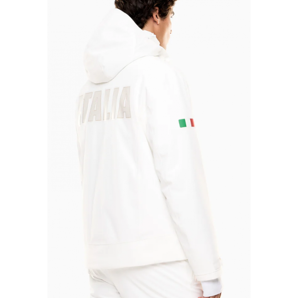 Giubbotto da sci EA7 realizzato nel rivoluzionario tessuto PROTECTUM7, che garantisce impermeabilità e traspirabilità per prestazioni ottimali in qualsiasi condizione atmosferica e attività fisica. Cappuccio removibile con dettaglio tricolore interno, due tasche frontali con zip e scomparti interni per praticità. L'imbottitura STRATUM7 RECYCLED, in microfibra realizzata interamente da bottiglie di plastica riciclate, assicura isolamento termico sostenibile. Chiusura frontale con zip, polsi regolabili con velcro e dettaglio tricolore stampato sulla manica. Il logo Coni e EA7 sul petto e la maxi stampa ITALIA sulla schiena completano il design tecnico e olimpico. EA7 si conferma Official Outfitter ITALIA TEAM, per i Giochi Olimpici e Paralimpici Invernali di Milano Cortina 2026.