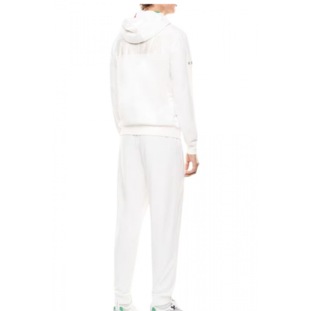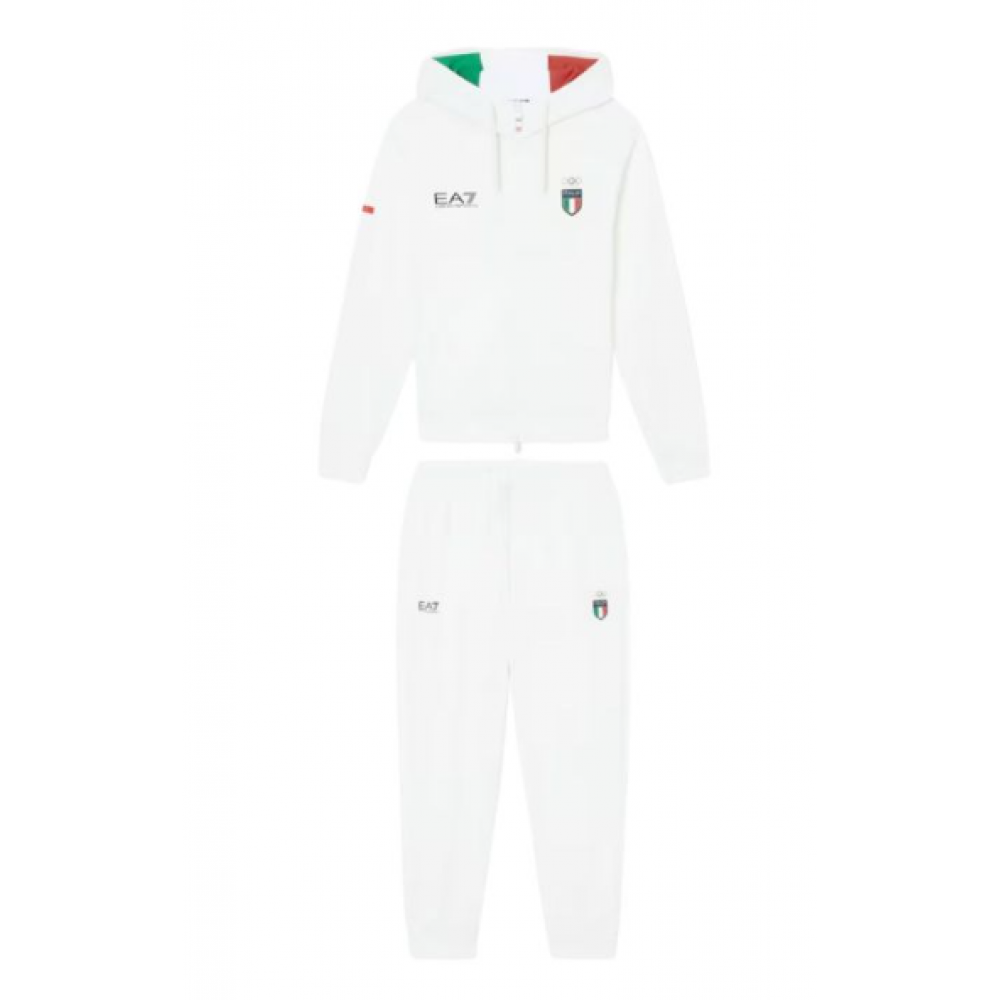La replica della speciale tuta indossata dal Team Italia, realizzata in morbido cotone. Il modello si compone di una felpa con cappuccio personalizzata dall'interno del cappuccio con stampa tricolore e dalla maxi scritta "ITALIA" sulla schiena, abbinata a un pantalone jogger con coulisse. Un modello che unisce comodità e stile dinamico per assicurarti comfort sia durante le tue sessioni di allenamento sia nei momenti di relax. Il capo è parte della speciale capsule sviluppata in occasione dei Giochi Olimpici Milano Cortina 2026. EA7 si conferma Official Outfitter ITALIA TEAM, fornendo l’abbigliamento sportivo degli atleti della squadra Olimpica Italiana.